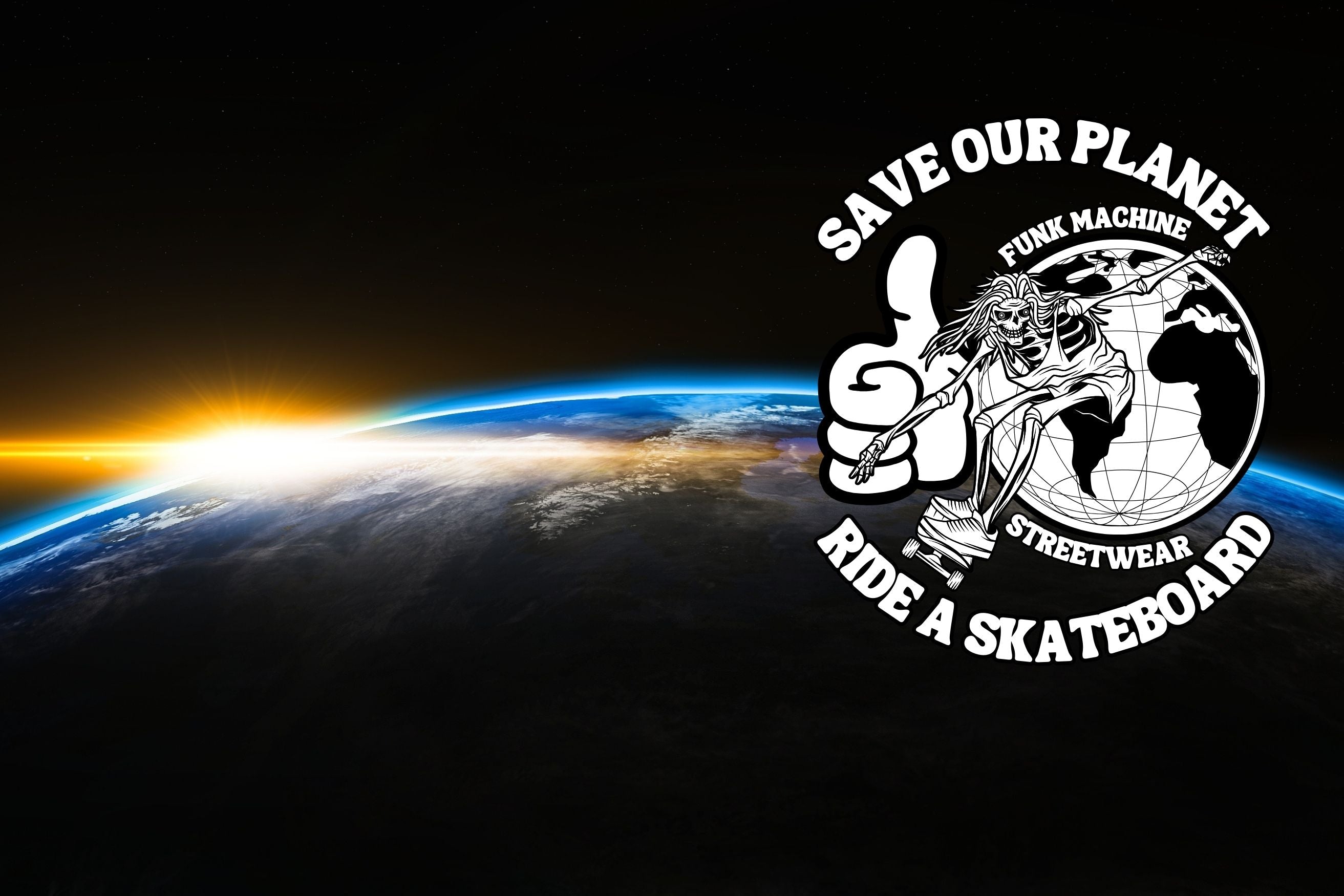 Choose FUNK MACHINE'S "SAVE OUR PLANET RIDE A SKATEBOARD!" line of streetwear...